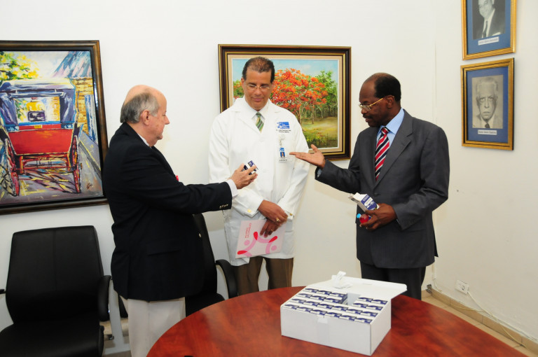 Los doctores José Ramírez Féliz y Andrés Lugo reciben la donación entregada por el doctor Nelson Figueroa, encargado del programa Mujeres Saludables del Despacho de la Primera Dama, que consistió en nueve cajas de 24 frascos, de 200 miligramos de Epirubicin, 19 frascos de Ectoposide de 100 miligramos, una caja con mil cánulas de diferentes tamaños, además, de 10 cajas de Lidocaína al dos por ciento, con 80 ampollas de 50 milímetros.