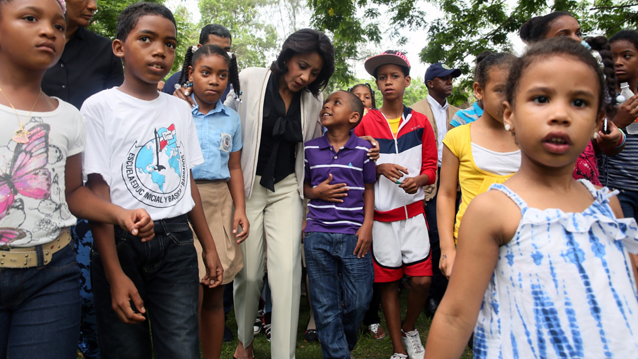 Cándida Montilla de Medina, esposa del presidente de las República, Danilo Medina, rodeado de niños y niñas presentes en la actividad.