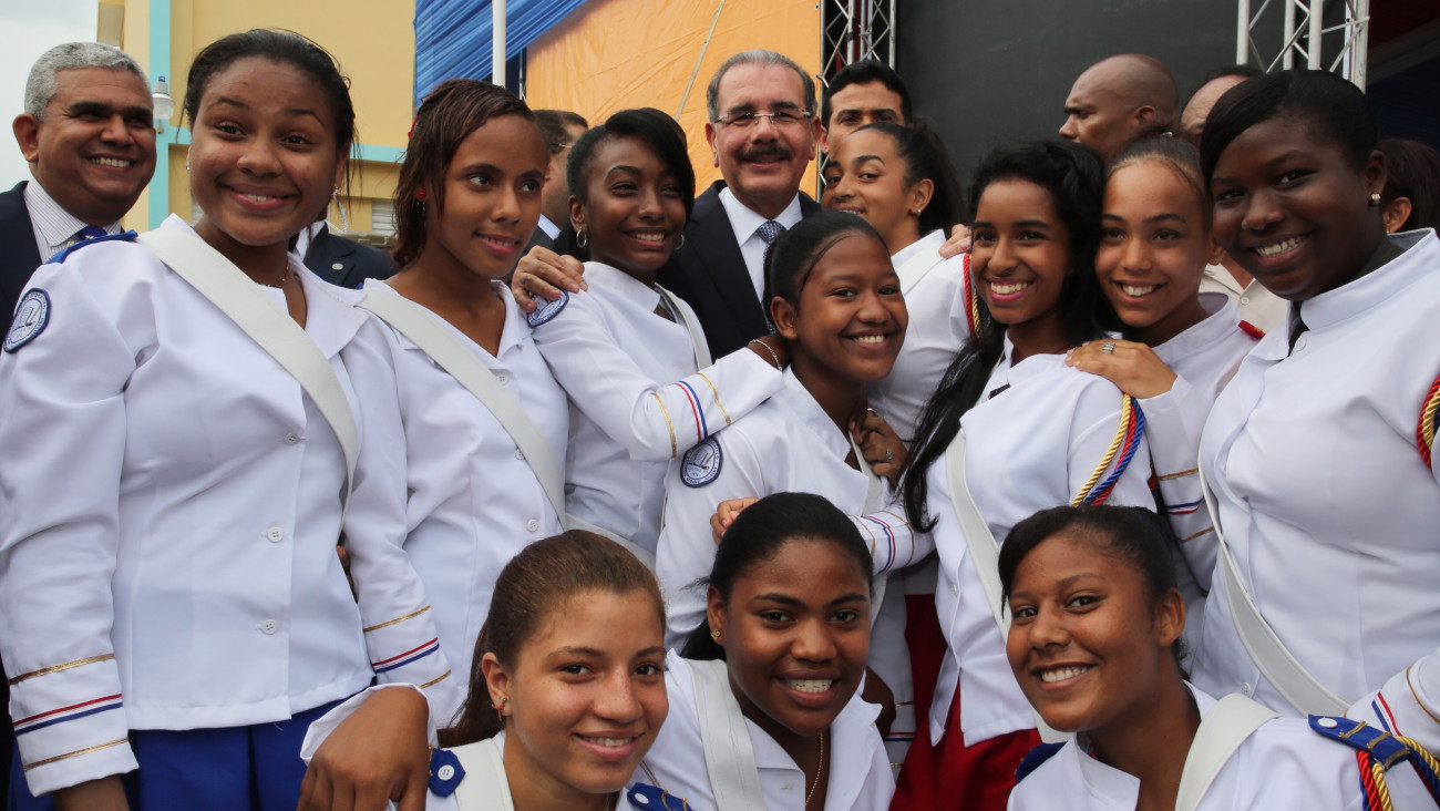 Al centro, el presidente Danilo Medina junto a integrantes del Batón Ballet de uno de los centros educativos puestos en funcionamiento, con lo que quedaron incorporadas 118 aulas más, a la Jornada de Tanda Extendida, para beneficiar una matrícula de 4,130 estudiantes.