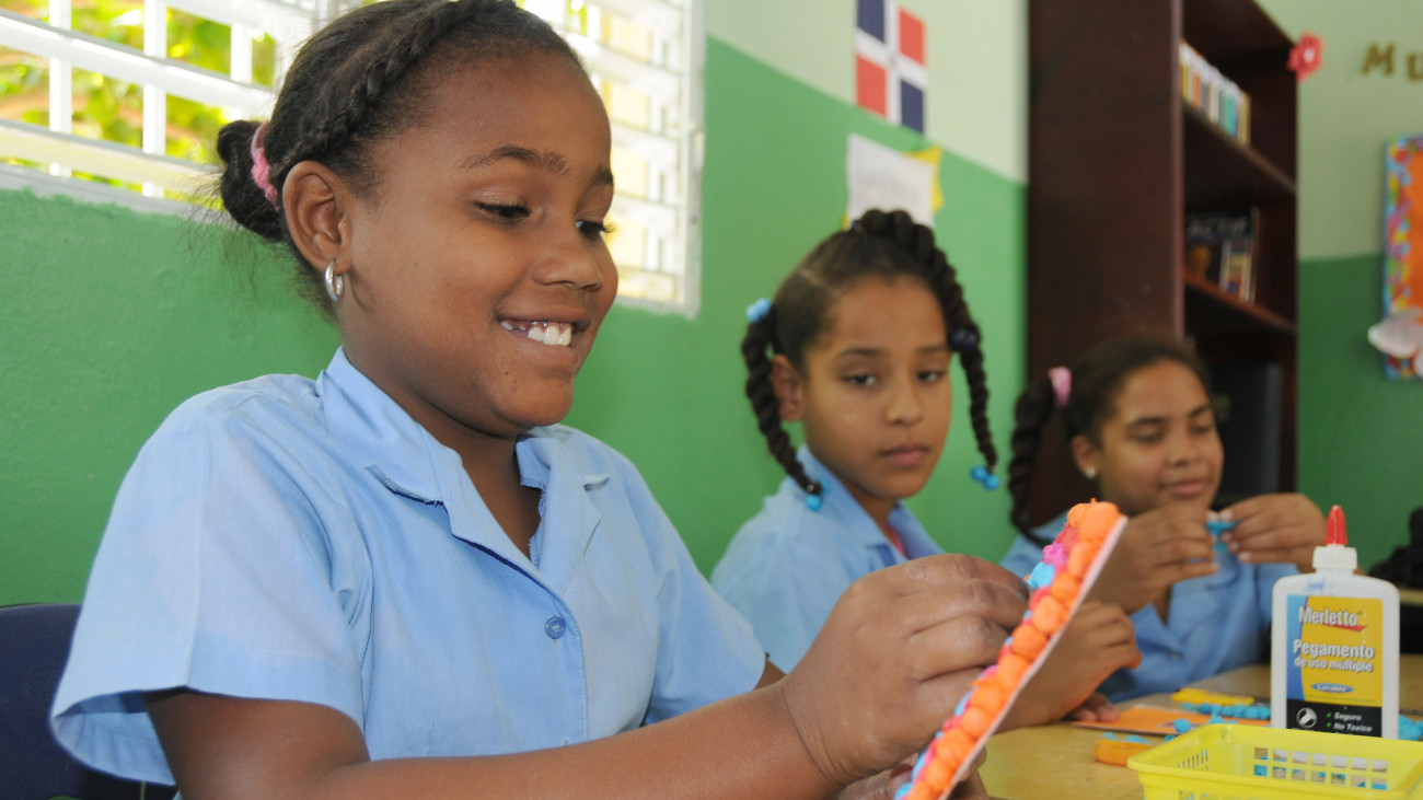 Estudiantes del Centro Educativo Magüey, Las Uvas, en provincia La Vega, muestran su entusiasmo durante sus labores de capacitación contempladas en la Tanda Extendida, que incluyen clases de manualidades, de cocina, de instrumentos musicales como la flauta, práctica gimnasia rítmica y deportes, entre otras actividades.