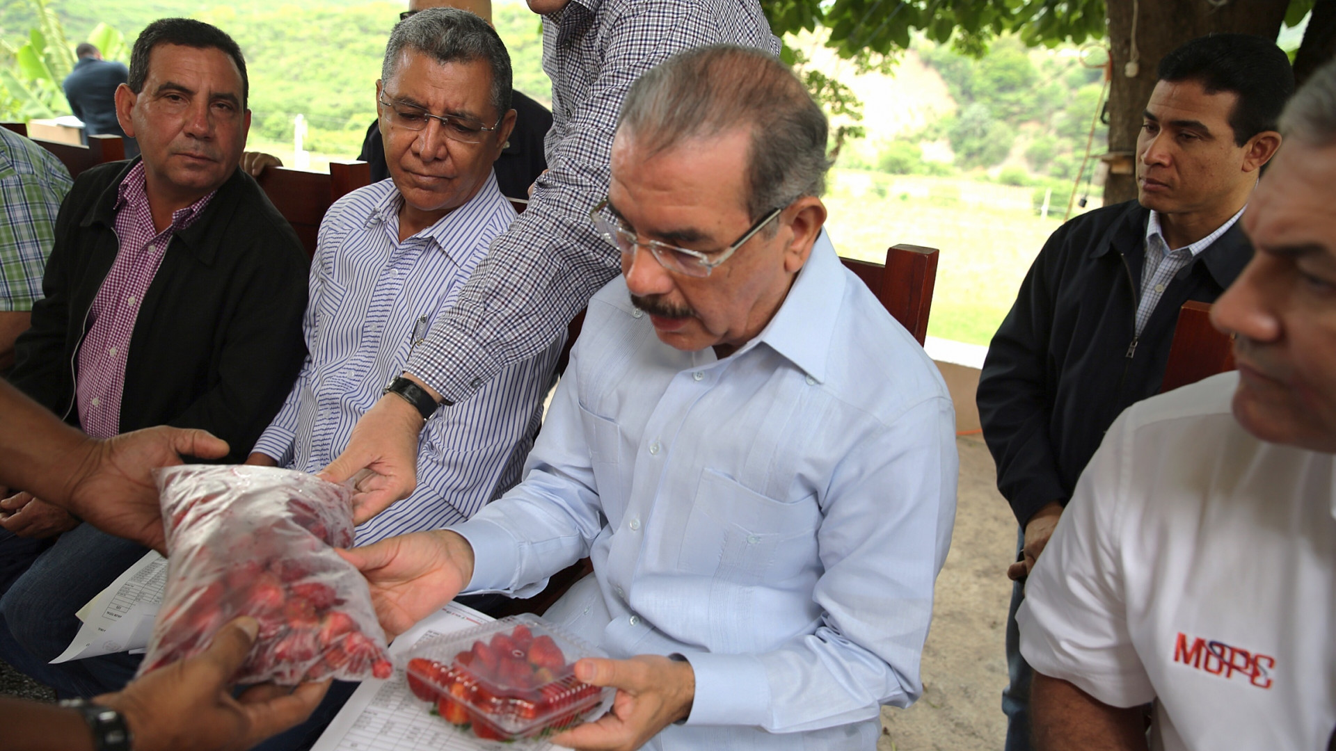 El presidente Medina junto a Antonio López, director del FEDA, observan muestras de fresas producidas en la zona.