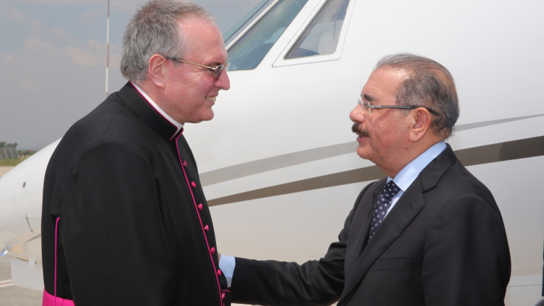 Presidente de la República, Danilo Medina Sánchez saluda al nuncio Fernando Chica Arellano, enviado por la Santa Sede, quien recibió al mandatario dominicano a su llegada a Roma para reunirse mañana en audiencia privada con el Papa Francisco, en El Vaticano.