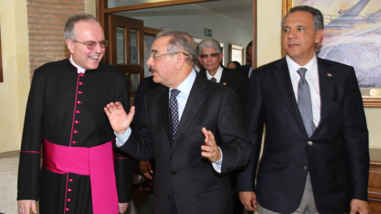 Nuncio Fernando Chica Arellano, jefe de la Sección Española de la Secretaría de Estado de la Santa Sede; Presidente de la República, Danilo Medina Sánchez y ministro administrativo de la Presidencia, José Ramón Peralta, durante su arribo a Roma para reunirse mañana en audiencia privada con el Papa Francisco, en el Vaticano.