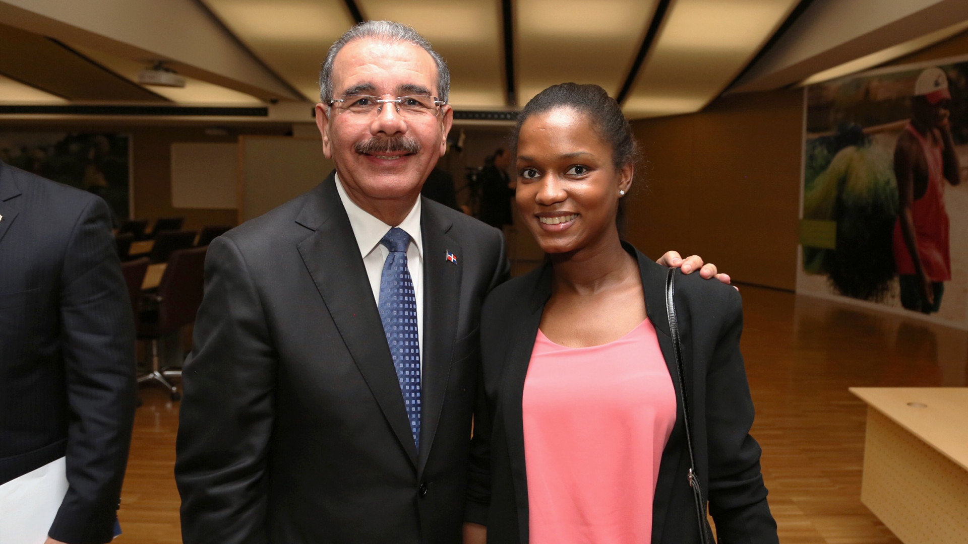 Presidente de la República, Danilo Medina y joven dominicana presente, durante la visita del mandatario a la sede principal del FIDA.