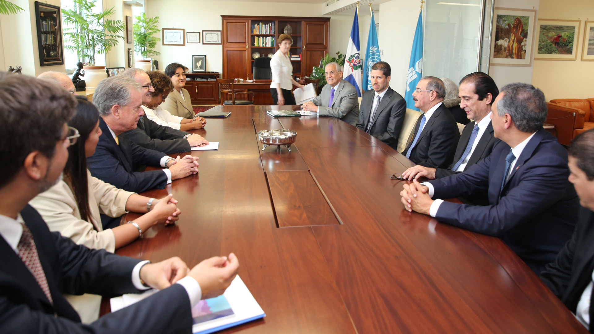 Participación del presidente de la República, Danilo Medina Sánchez junto a directivos del Fondo Internacional de Desarrollo Agrícola (FIDA), encabezados por su vicepresidente, Michel Mordasini. El mandatario dominicano pidió la colaboración de FIDA para conseguir mercados para los productos del país. Expresó: "De nada sirve aumentar la producción si no hay mercado".
