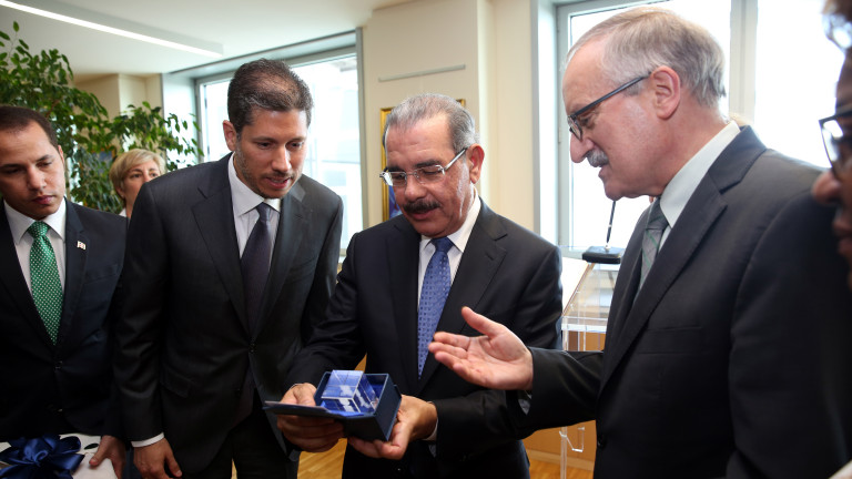 Presidente de la República, Danilo Medina Sánchez recibe un presente de manos de Michel Mordasini, vicepresidente del Fondo Internacional de Desarrollo Agrícola (FIDA), en representación de todos los directivos de esa institución.