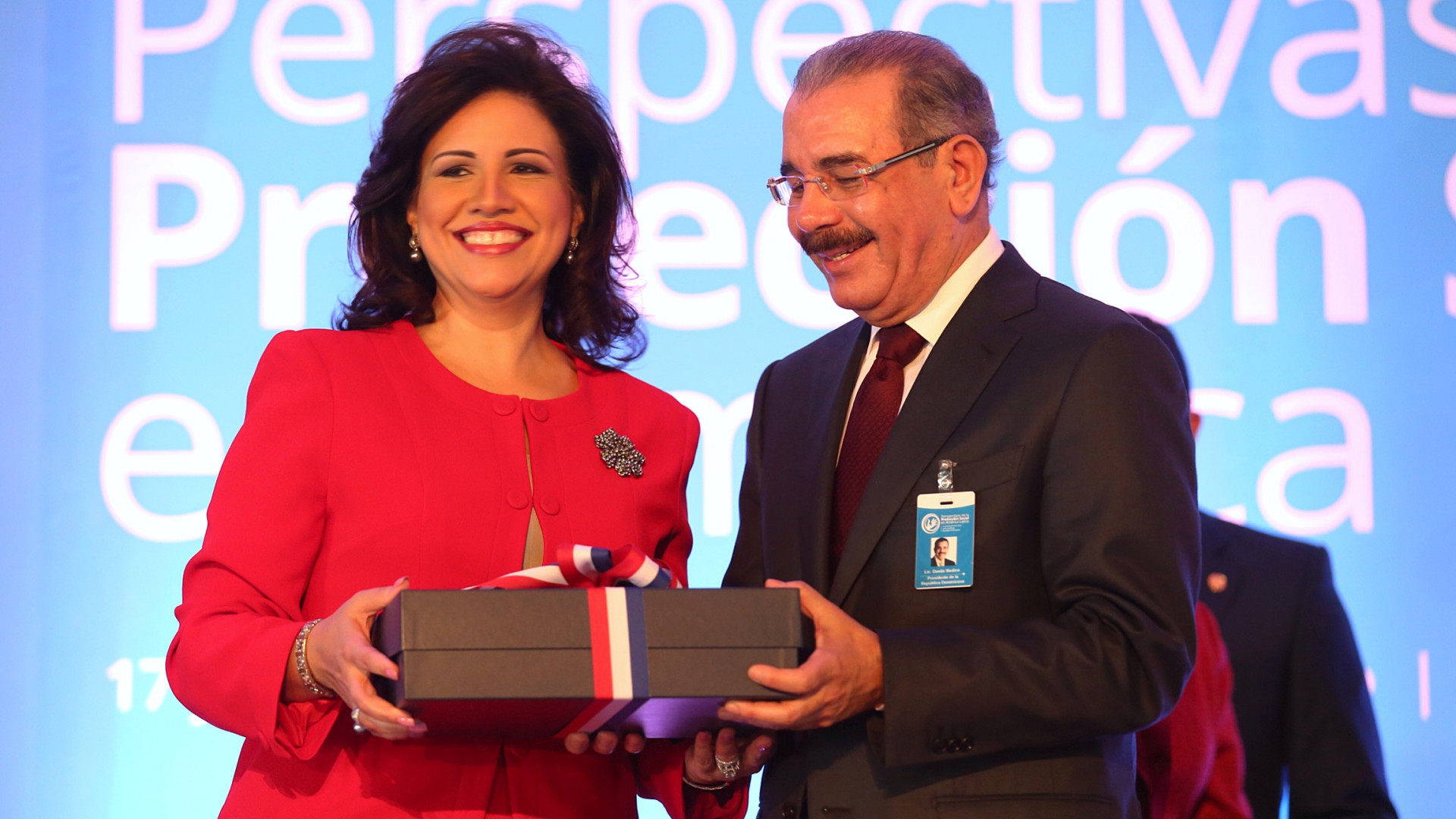 El presidente de la República, Danilo Medina, y la vicepresidenta Margarita Cedeño de Fernández intercambian obsequios previo al acto.