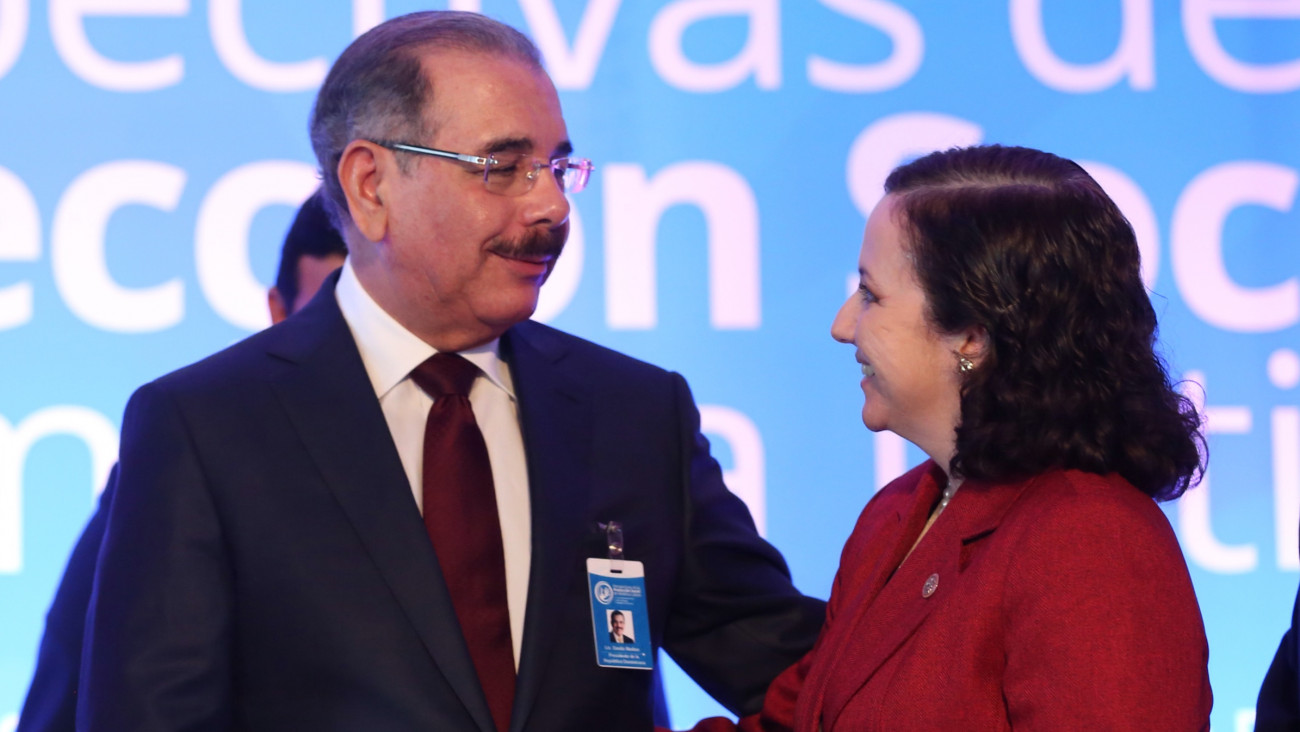 El presidente de la República, Danilo Medina, saluda a Ana Hazel Escrich, secretaria general de Integración Social Centroamericana (SISCA).