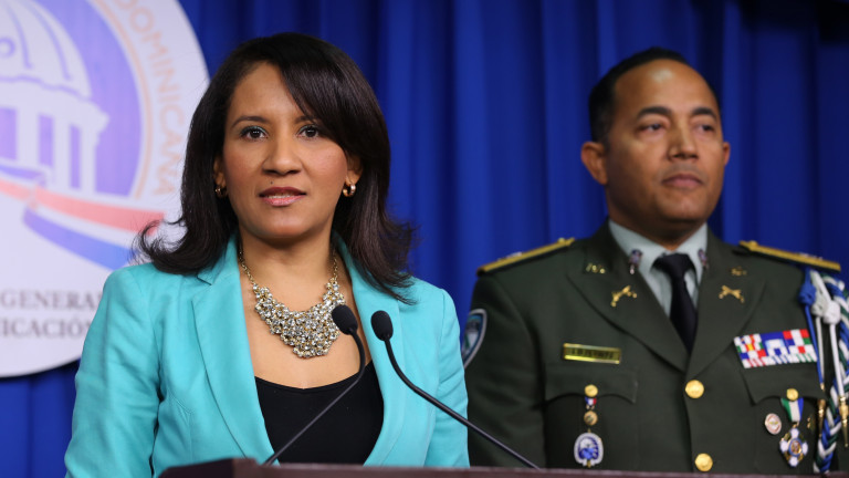 La viceministra de la Presidencia y portavoz del Sistema 911, Zoraima Cuello, durante la conferencia de prensa en el Salón Orlando Martínez del Palacio Nacional, donde informó que se han reducido de manera considerable las llamadas molestosas. Observa, el general Juan Gerónimo Brown Pérez, director de la Autoridad Metropolitana de Transporte (Amet).