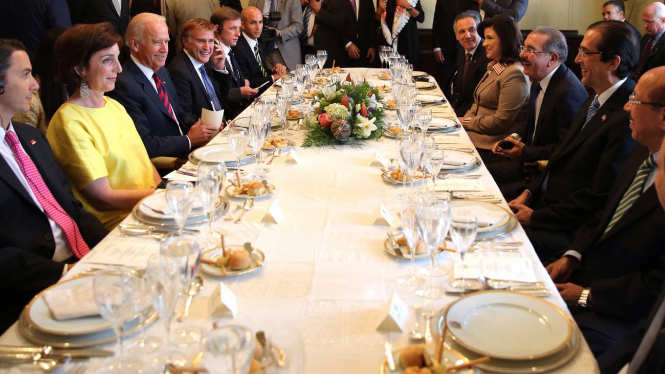 El presidente de la República, Danilo Medina, y el vicepresidente de los Estados Unidos, Joseph Biden, junto a sus respectivas comitivas, comparten en el Salón-Comedor del Palacio Nacional, el jueves 19 de junio de 2014, donde el mandatario Medina ofreció un almuerzo luego de la reunión que sostuvieron para tratar temas de la relación bilateral y cooperación regional, entre otros aspectos, y de la declaración conjunta que realizaron ante la prensa nacional y extranjera.