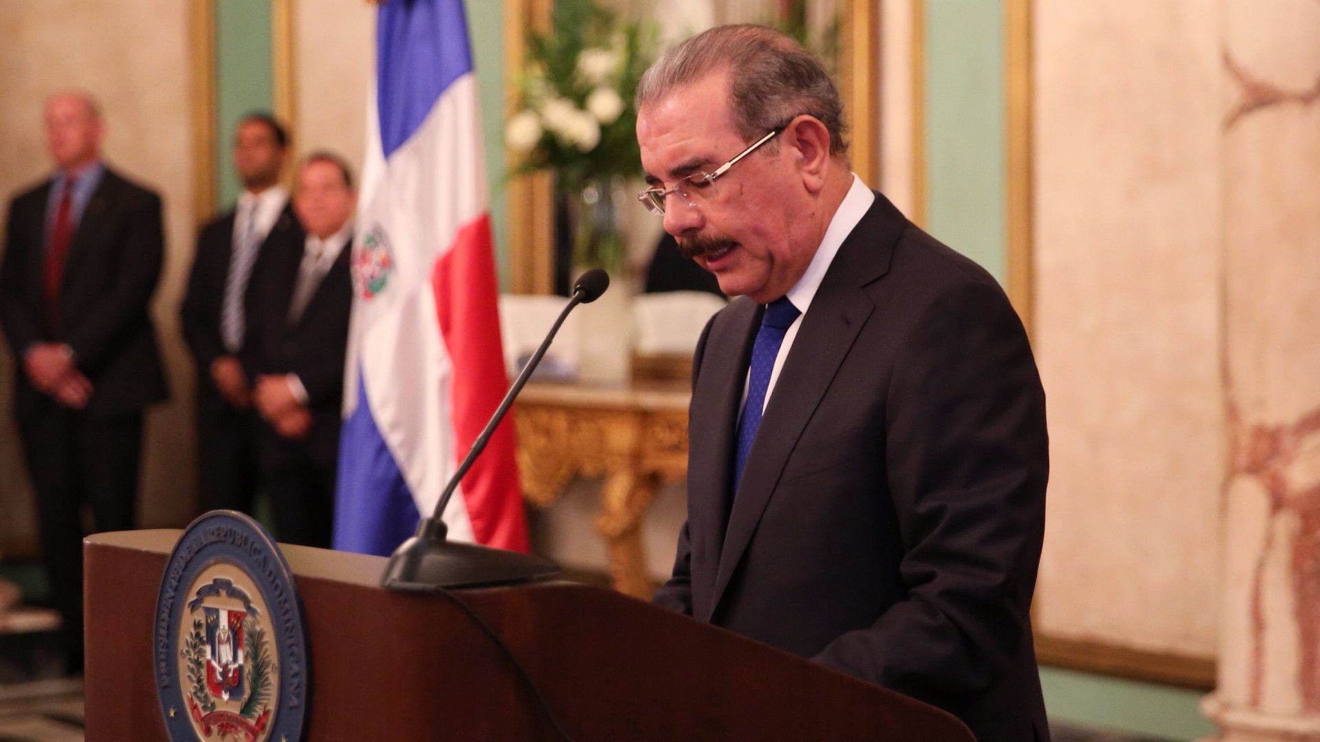 El presidente de la República, Danilo Medina, expresa su discurso durante la declaración conjunta con el vicepresidente de los Estados Unidos, Joseph Biden, en el Salón de Embajadores del Palacio Nacional de Santo Domingo, el jueves 19 de junio de 2014, luego de la reunión que sostuvieron en la que pasaron revista a la relación bilateral de sus naciones, tocando puntos de mutuo interés como la seguridad, el narcotráfico, la energía y el comercio.