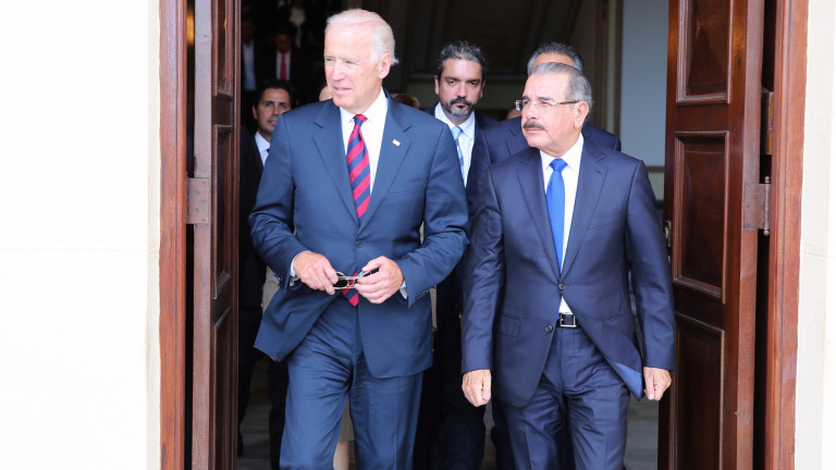 El presidente de la República, Danilo Medina, y el vicepresidente de los Estados Unidos, Joseph Biden, salen de la reunión que sostuvieron el jueves 19 de junio de 2014, en el Palacio Nacional de Santo Domingo, en la que pasaron revista a la relación bilateral de sus naciones, tocando puntos de mutuo interés como la seguridad, el narcotráfico, la energía y el comercio en un diálogo franco, abierto y respetuoso entre amigos.