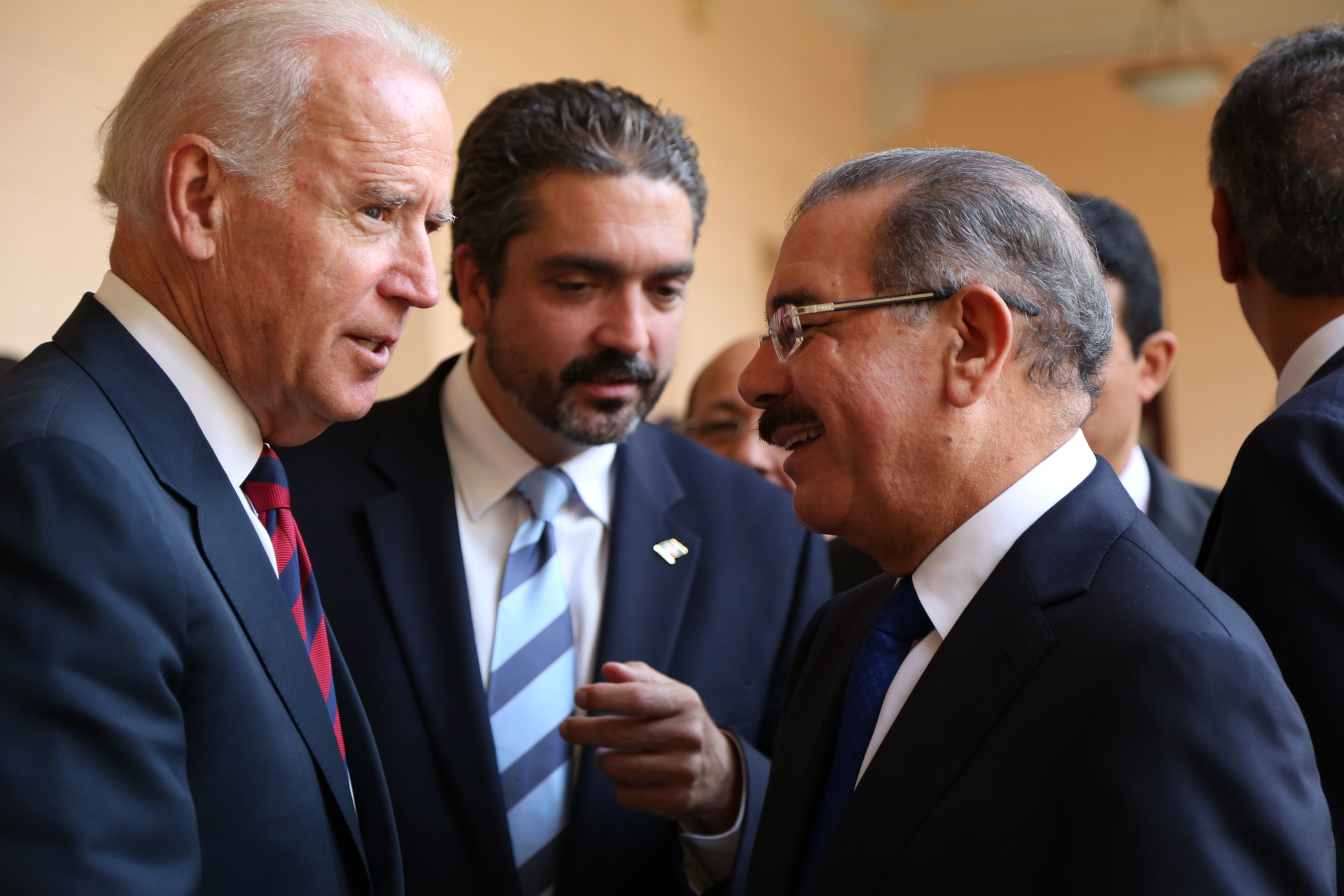 El presidente de la República, Danilo Medina, y el vicepresidente de los Estados Unidos, Joseph Biden, conversan de manera cordial en el Palacio Nacional de Santo Domingo, el jueves 19 de junio de 2014, luego de la reunión que sostuvieron en la que pasaron revista a la relación bilateral de sus naciones en un diálogo franco, abierto y respetuoso entre amigos.