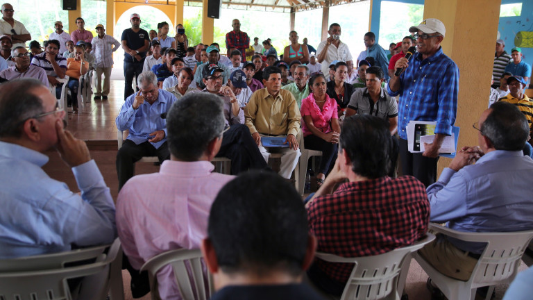 El mandatario Medina estuvo acompañado por los ministros Administrativo de la Presidencia, José Ramón Peralta; de Obras Públicas y Comunicaciones, Gonzalo Castillo; de Agricultura, Ángel Estévez; el administrador del Banco Agrícola, Carlos Segura Foster; y el director del Fondo Especil para el Desarrollo Agropecuario (FEDA), Antonio López.