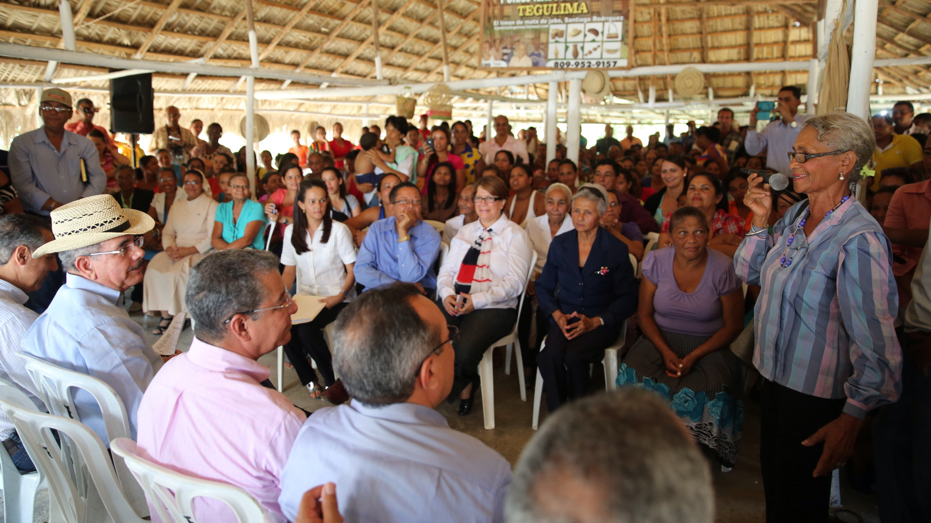 El presidente de la República, Danilo Medina, escuchó con atención las peticiones de las integrantes de la Asociación de Mujeres Teje Arte de Guano (AMTAGUANO) y de la Federación de Mujeres Unidas de María, en Mata de Jobo, Santiago Rodríguez.