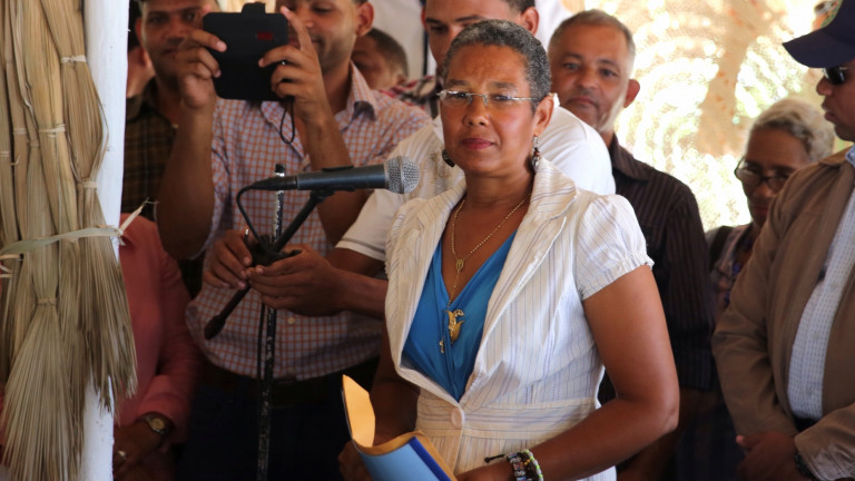 Olga de Jesús, de la Federación de Mujeres Unidas de María, en Mata de Jobo, Santiago Rodríguez, presentó al presidente Danilo Medina un proyecto de producción de carne de oveja.