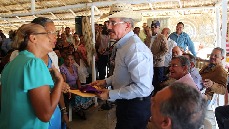 El presidente de la República, Danilo Medina, conversó con las integrantes de la Asociación de Mujeres Teje Arte de Guano (AMTAGUANO) y de la Federación de Mujeres Unidas de María, en Mata de Jobo, Santiago Rodríguez.