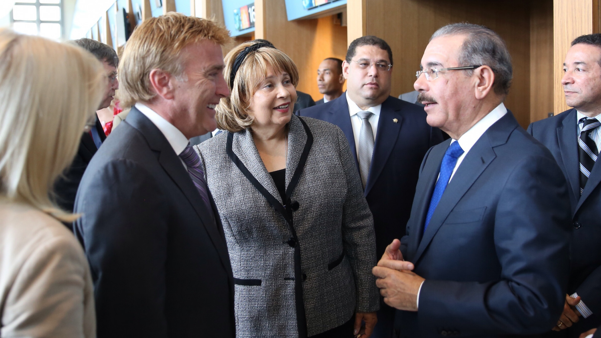 El presidente Danilo Medina conversa con el embajador de los Estados Unidos en el país, James W. Brewster, y varios funcionarios,presentes en el evento.