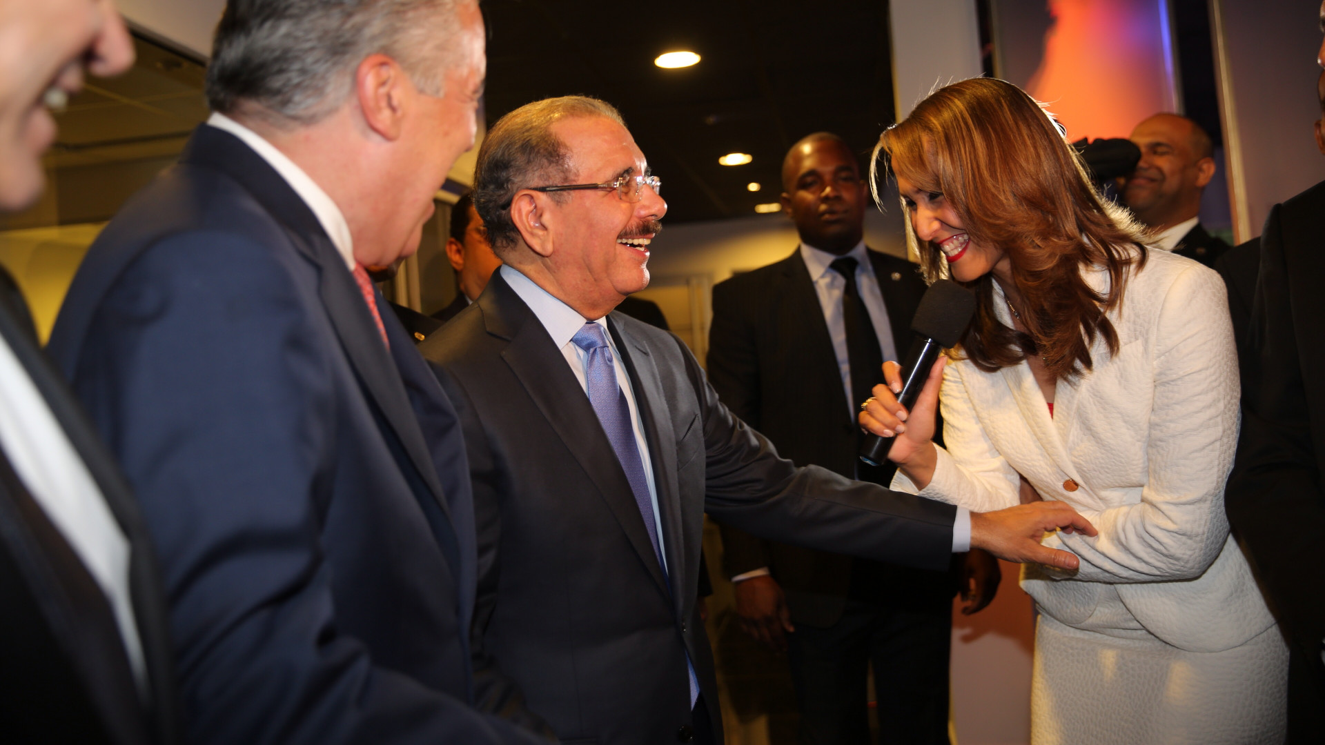 El presidente Danilo Medina sonríe con la periodista Katherine Díaz, luego de encabezar el acto de inauguración de las nuevas instalaciones del Grupo SIN, y aprovechó para desear las mejores de las suertes a los ejecutivos y empleados de esa empresa que, tras una alianza estratégica, produce programas noticiosos y de opinión para la televisora Color Visión.
