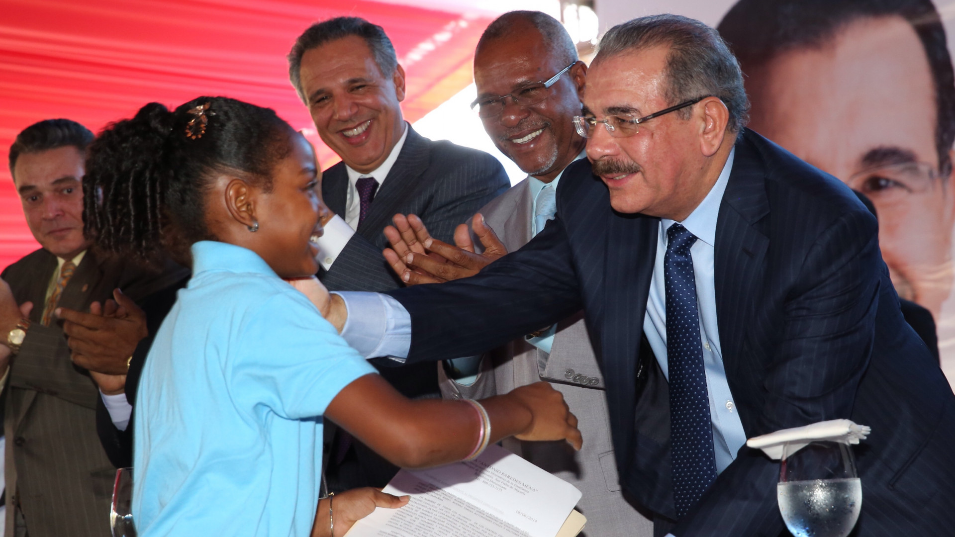 El presidente Medina saluda a la alumna Annery del Carmen Reinoso, luego de haber expresado su mensaje.