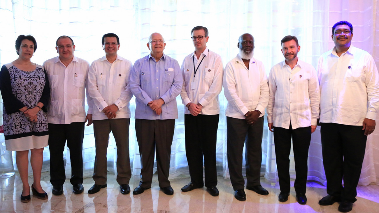Los cancilleres de Honduras, Mireya Agüero de Corrales; de Guatemala, Luis Fernando Carrera Castro; de El Salvador y secretario general del Sistema de la Integración Centroamericana (SICA), Hugo Martínez; de República Dominicana, Carlos Morales Troncoso; de Costa Rica, Manuel González Sanz; de Belice, Wilfred Elrington; de Panamá, Francisco Álvarez De Soto; y el vicecanciller de Nicaragua, Valdrak Jaentschke; posan en la foto oficial, luego de participar en la reunión del Consejo de Ministros de Relaciones Exteriores del SICA, previo a la XLIII Reunión Ordinaria Jefes de Estado y de Gobierno de ese organismo regional en Punta Cana, República Dominicana.