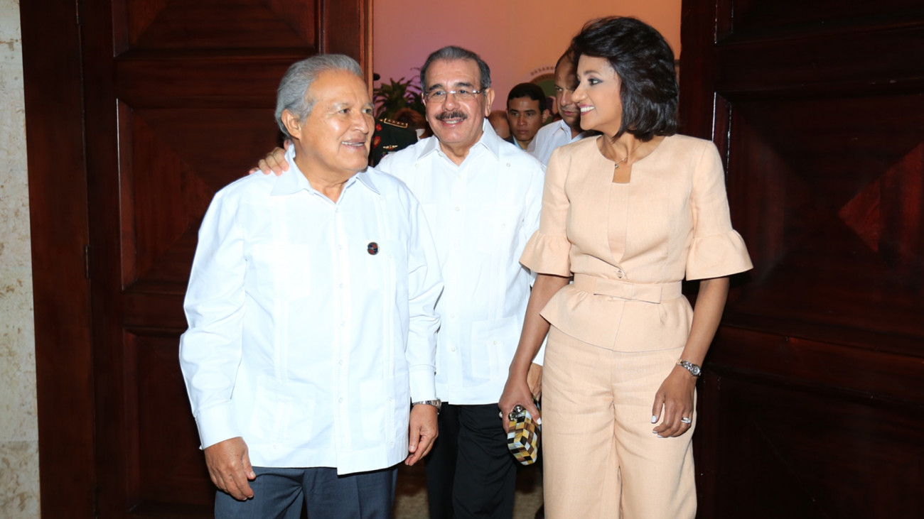 El presidente Danilo Medina, la primera dama Cándida Montilla de Medina y el mandatario de El Salvador, Salvador Sánchez Cerén, durante la cena y espectáculo cultural en honor a los Jefes de Estado y de Gobierno de los Estados miembros del Sistema de la Integración Centroamericana (SICA) y sus respectivas delegaciones.