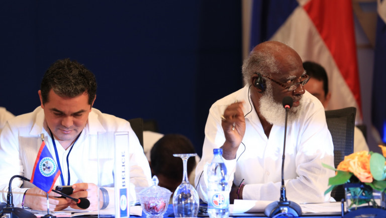 El canciller de Belice, Wilfred Elrington (derecha), expone en la apertura de la reunión del Consejo de Ministros de Relaciones Exteriores del Sistema de la Integración Centroamericana (SICA), correspondiente a la XLIII Cumbre de Jefes de Estado y de Gobierno de ese organismo regional en Punta Cana. El presidente dominicano, Danilo Medina, será el encargado de dirigir los trabajos de la agenda en la Cumbre, el 27 de junio de 2014, que es la primera que se realiza de mandatarios durante la Presidencia Pro Témpore de la República Dominicana.