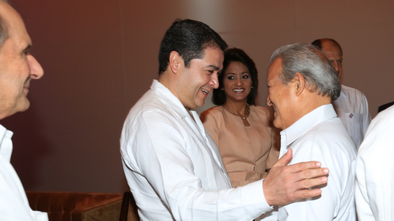 Los mandatarios de Honduras, Juan Orlando Hernández; y de El Salvador, Salvador Sánchez Cerén; se saludan durante la cena y espectáculo cultural en honor a los Jefes de Estado y de Gobierno de los Estados miembros del Sistema de la Integración Centroamericana (SICA) y sus respectivas delegaciones.