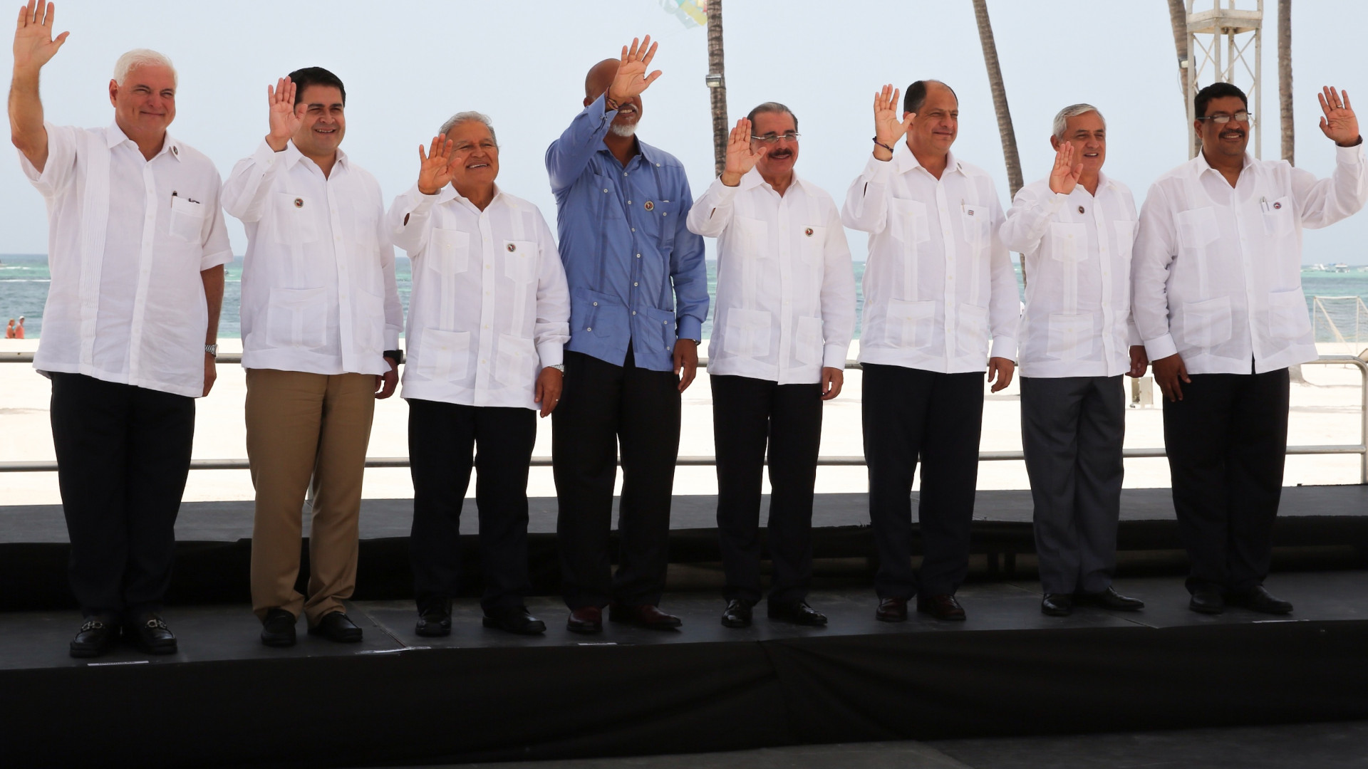 Foto oficial de la XLIII Cumbre deJefes de Estado y de Gobierno del Sistema de la Integración Centroamericana (SICA) en Punta Cana, el 27 de junio de 2014. Figuran, los presidentes de Panamá, Ricardo Martinelli; de Honduras, Juan Orlando Hernández; de El Salvador, Salvador Sánchez Cerén; el primer ministro de Belice, Dean Barrow; los mandatarios de República Dominicana, Danilo Medina; de Costa Rica, Luis Guillermo Solís; de Guatemala, Otto Pérez Molina; y el vicecanciller de Nicaragua, Valdrack Jaentschke.