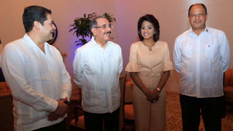 El presidente Danilo Medina, la primera dama Cándida Montilla de Medina, los mandatarios de Honduras, Juan Orlando Hernández; y de Costa Rica, Luis Guillermo Solís; durante la cena y espectáculo cultural en honor a los Jefes de Estado y de Gobierno de los Estados miembros del Sistema de la Integración Centroamericana (SICA) y sus respectivas delegaciones.