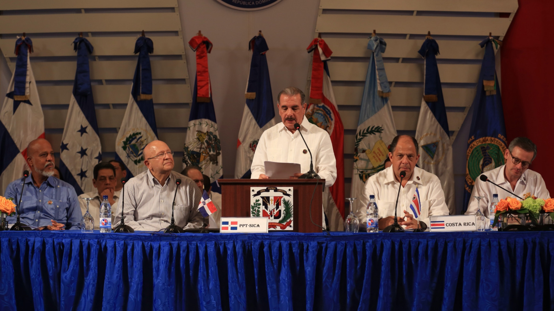 El presidente dominicano, Danilo Medina, durante el encuentro con los mandatarios y representantes de la Federación de Entidades Privadas de Centroamérica, Panamá y República Dominicana (FEDEPRICAP), en el marco de la XLIII Cumbre de Jefes de Estado y de Gobierno del Sistema de la Integración Centroamericana (SICA) en Punta Cana, el 27 de junio de 2014. Observan, el primer ministro de Belice, Dean Barrow; el canciller dominicano, Carlos Morales Troncoso; el presidente de Costa Rica, Luis Guillermo Solís; y el canciller de Panamá, Francisco Álvarez De Soto. Medina proclamó que la mejor forma de abordar los retos y oportunidades que se presentan en Centroamérica, es con la alianza estratégica entre los sectores públicos y privados.
