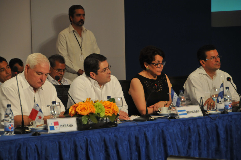 Los presidentes de Panamá, Ricardo Martinelli; de Honduras, Juan Orlando Hernández; la canciller hondureña, Mireya Agüero de Corrales; y el secretario general del SICA, Hugo Martínez, durante el encuentro con los mandatarios y representantes de la Federación de Entidades Privadas de Centroamérica, Panamá y República Dominicana (FEDEPRICAP), en el marco de la XLIII Cumbre de Jefes de Estado y de Gobierno del Sistema de la Integración Centroamericana (SICA) en Punta Cana, el 27 de junio de 2014.