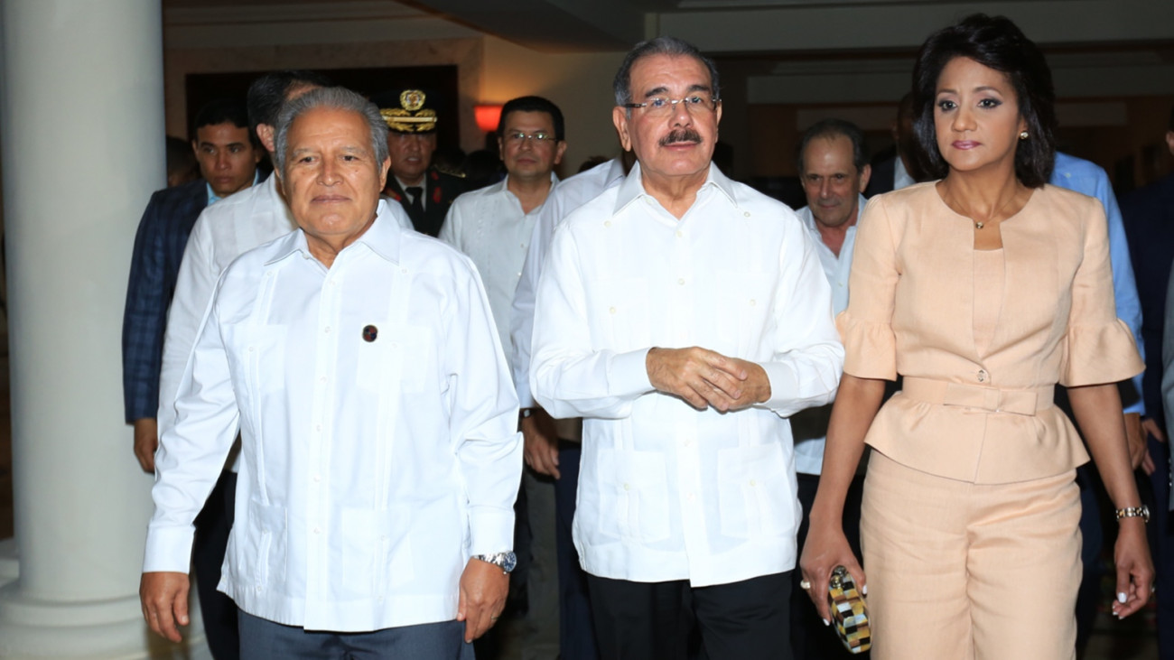 El presidente Danilo Medina, la primera dama Cándida Montilla de Medina y el mandatario de El Salvador, Salvador Sánchez Cerén, durante la cena y espectáculo cultural en honor a los Jefes de Estado y de Gobierno de los Estados miembros del Sistema de la Integración Centroamericana (SICA) y sus respectivas delegaciones.