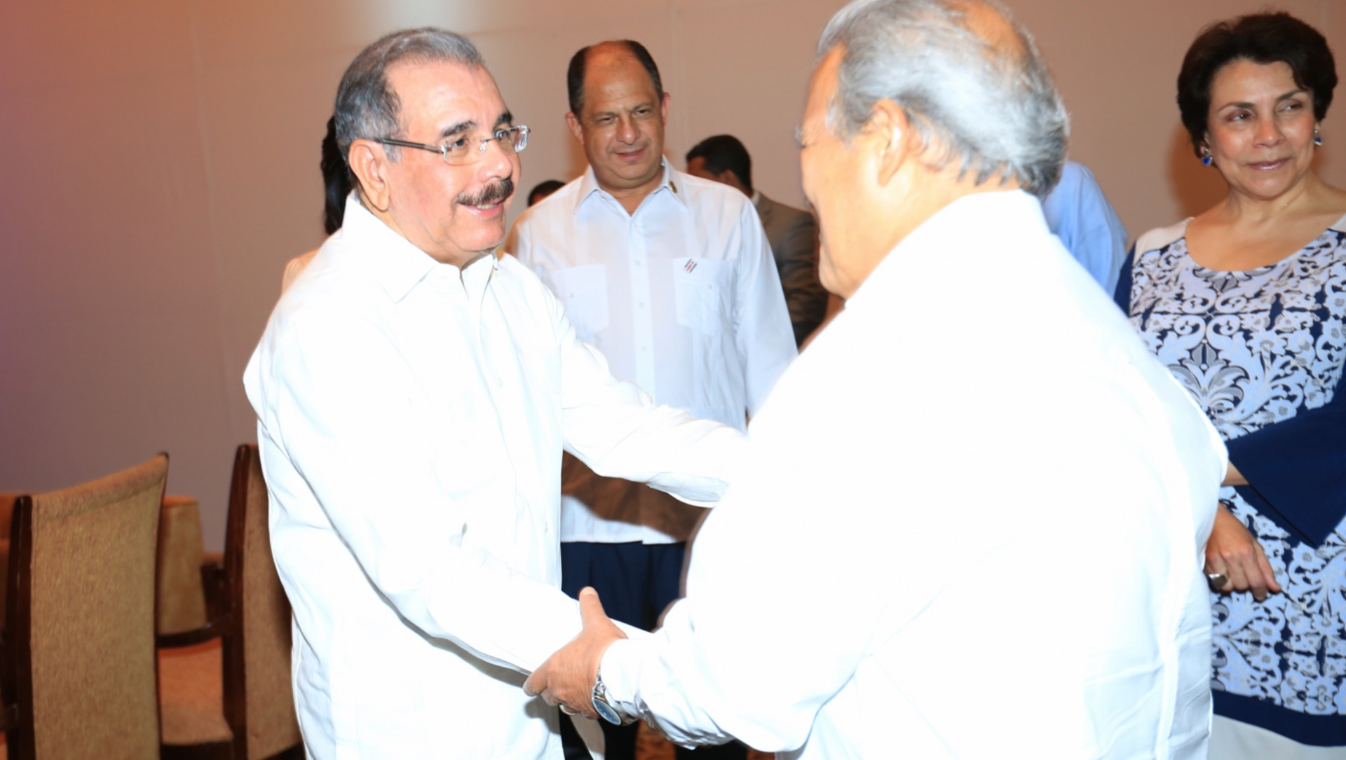 El presidente Danilo Medina saluda al mandatario de El Salvador, Salvador Sánchez Cerén, durante la cena y espectáculo cultural en honor a los Jefes de Estado y de Gobierno de los Estados miembros del Sistema de la Integración Centroamericana (SICA) y sus respectivas delegaciones.