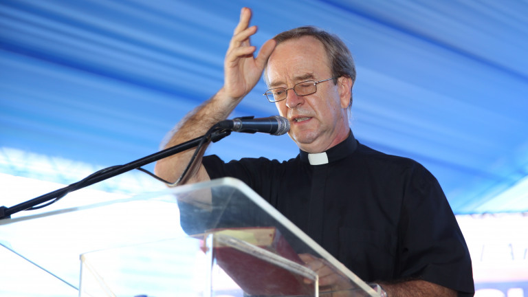 Juan José Zaroh, párroco de la iglesia Nuestra Señora de la Consolación, bendice los planteles escolares entregados por el presidente Danilo Medina.