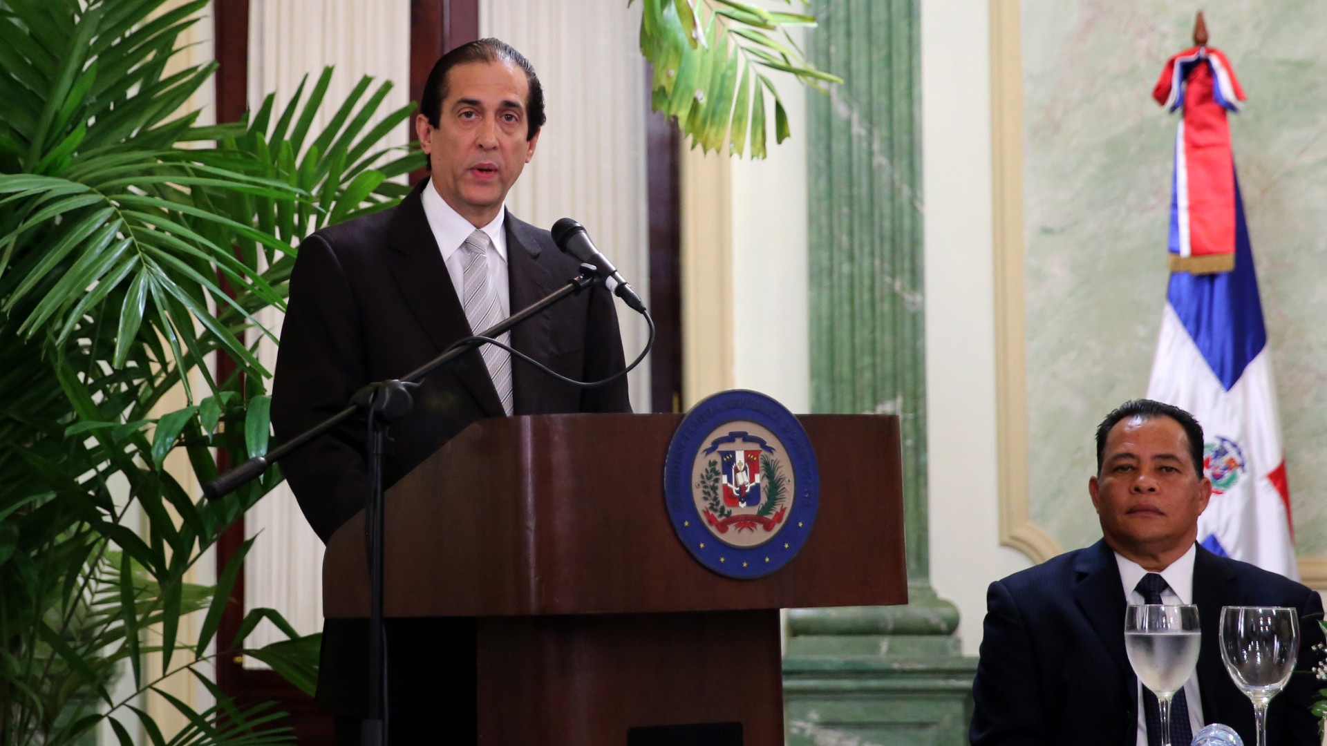 El ministro de la Presidencia, Gustavo Montalvo, expresa su discurso durante el acto de la firma del acuerdo entre el Gobierno de la República Dominicana y el Programa de las Naciones Unidas para el Desarrollo (PNUD) para evaluar el impacto de las visitas sorpresa del presidente Danilo Medina, celebrado en el Salón Verde del Palacio Nacional, el 3 de julio de 2014, donde resaltó que en la gestión actual se trabaja con seriedad y con la intención de cumplir siempre con la palabra empeñada. Observa, Justo Guzmán, coordinador Ejecutivo de los Proyectos de la Presidencia.