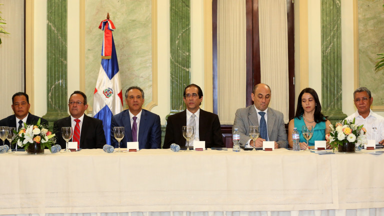 Justo Guzmán, coordinador Ejecutivo de los Proyectos de la Presidencia; Ángel Estévez, ministro de Agricultura; José Ramón Peralta, ministro Administrativo de la Presidencia; Gustavo Montalvo, ministro de la Presidencia; Lorenzo Jiménez de Luis, representante del PNUD en la República Dominicana; Angie Bargés, oficial de Gobernabilidad del Programa de las Naciones Unidas para el Desarrollo; y Antonio López, director General del Fondo Especial para el Desarrollo Agropecuario (FEDA); ocupan la mesa principal en el acto de firma del acuerdo entre el Gobierno de la República Dominicana y la Organización de las Naciones Unidas (ONU) para evaluar el impacto de las visitas sorpresa del presidente Danilo Medina, celebrado en el Salón Verde del Palacio Nacional, el 3 de julio de 2014.