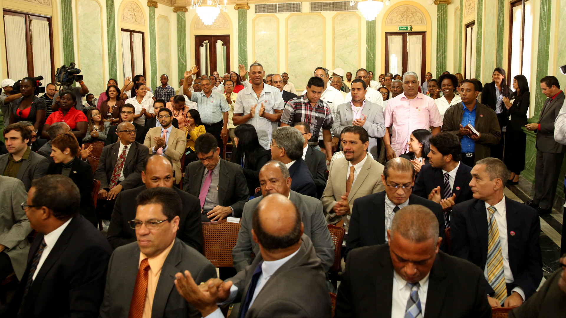 Beneficiarios de las visitas sorpresa del presidente Danilo Medina asistieron al acto de firma del acuerdo entre el Gobierno de la República Dominicana y el Programa de las Naciones Unidas para el Desarrollo (PNUD) para evaluar el impacto de estas iniciativas, celebrado en el Salón Verde del Palacio Nacional, el 3 de julio de 2014.
