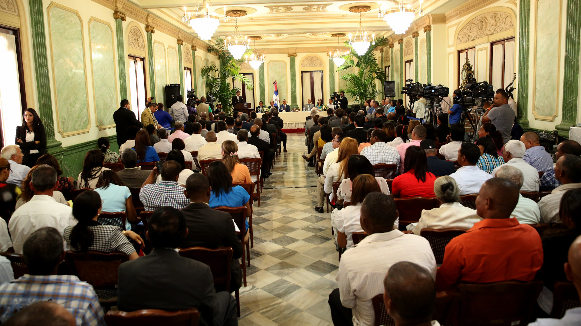 Asistentes al acto de firma del acuerdo entre el Gobierno de la República Dominicana y el Programa de las Naciones Unidas para el Desarrollo (PNUD) para evaluar el impacto de las visitas sorpresa del presidente Danilo Medina, celebrado en el Salón Verde del Palacio Nacional, el 3 de julio de 2014. Fotos: Raúl Pérez y Luis Ruiz Tito/Presidencia República Dominicana www.youtube.com/watch?v=Zdrdb6R2jtw