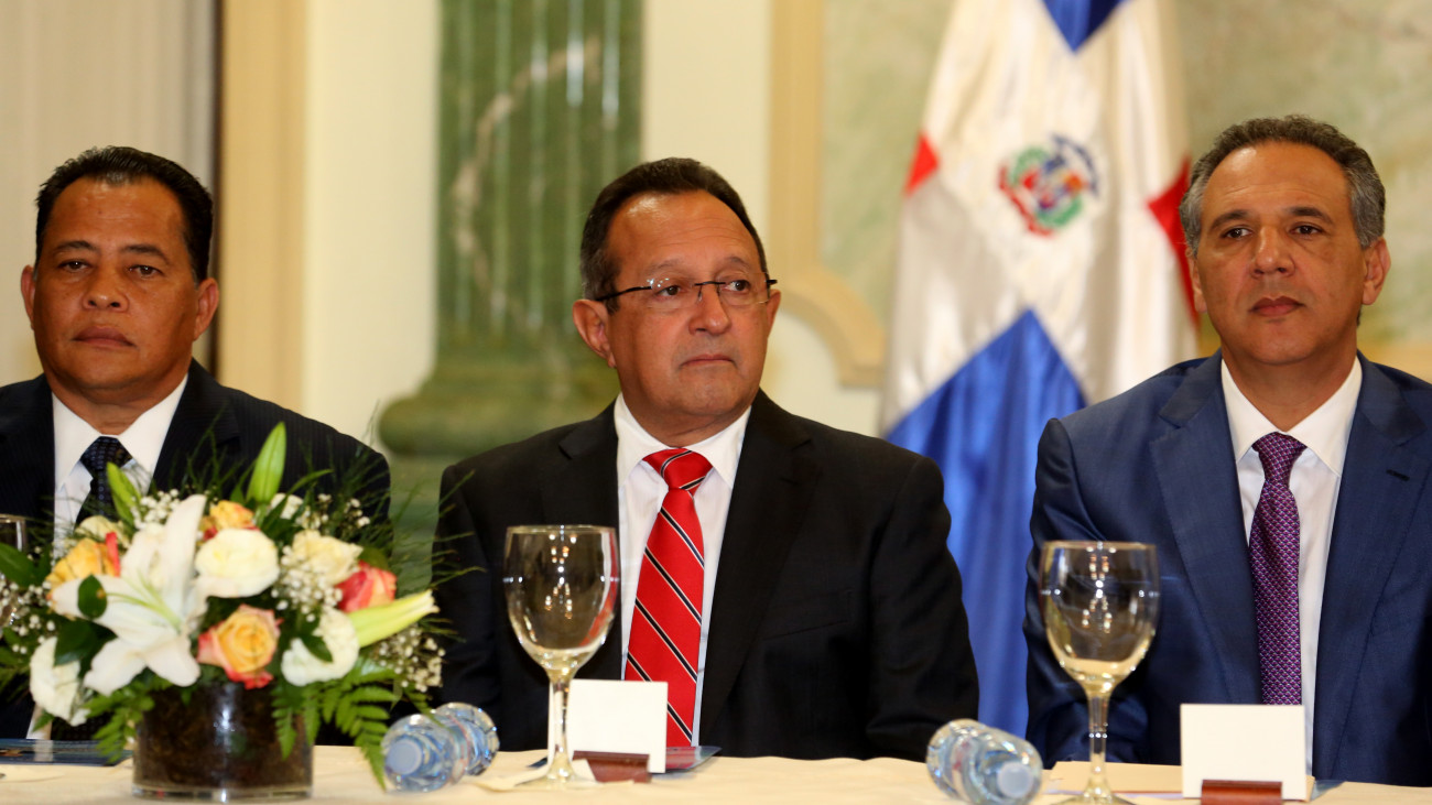 Justo Guzmán, coordinador Ejecutivo de los Proyectos de la Presidencia; Ángel Estévez, ministro de Agricultura; y José Ramón Peralta, ministro Administrativo de la Presidencia; en la mesa principal del acto de firma del acuerdo entre el Gobierno de la República Dominicana y el Programa de las Naciones Unidas para el Desarrollo (PNUD) para evaluar el impacto de las visitas sorpresa del presidente Danilo Medina, celebrado en el Salón Verde del Palacio Nacional, el 3 de julio de 2014.