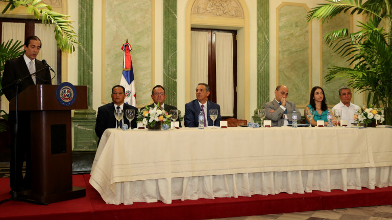 El ministro de la Presidencia, Gustavo Montalvo, expresa su discurso durante el acto de firma del acuerdo entre el Gobierno de la República Dominicana y el Programa de las Naciones Unidas para el Desarrollo (PNUD) para evaluar el impacto de las visitas sorpresa del presidente Danilo Medina, celebrado en el Salón Verde del Palacio Nacional, el 3 de julio de 2014. Figuran en la mesa principal, Justo Guzmán, coordinador Ejecutivo de los Proyectos de la Presidencia; Ángel Estévez, ministro de Agricultura; José Ramón Peralta, ministro Administrativo de la Presidencia; Gustavo Montalvo, ministro de la Presidencia; Lorenzo Jiménez de Luis, representante del PNUD en la República Dominicana; Angie Bargés, oficial de Gobernabilidad del Programa de las Naciones Unidas para el Desarrollo; y Antonio López, director del Fondo Especial para el Desarrollo Agropecuario (FEDA).