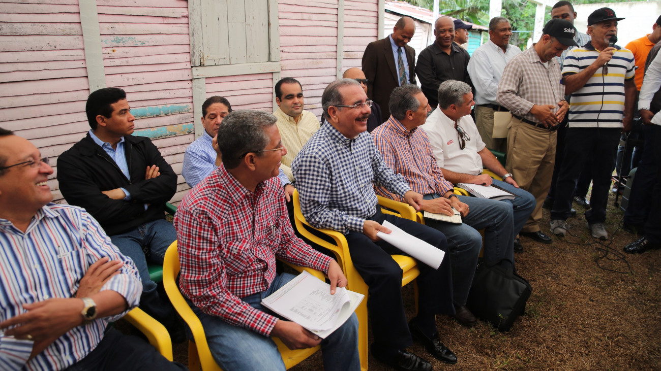 El presidente Danilo Medina y dirigentes de la Asociación de Ganaderos San Isidro (AGASI) y de la Federación de Mujeres en Desarrollo de Guerra (FEMUGUE), quienes pidieron apoyo para construir un centro de acopio que les permitiría agregar valor a la leche que producen y conservar mejor el producto. El centro beneficiaría tanto a los ganaderos como a las mujeres asociadas en FEMUGUE.