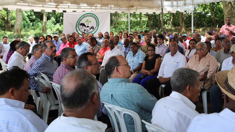 El presidente Danilo Medina durante su visita sorpresa a a la zona, donde anunció la aprobación de financiamientos oficiales a productores agropecuarios, de conejos, de biomasa y a miembros de la Asociación de Ganaderos San Isidro y de la Federación de Mujeres en Desarrollo de Guerra.