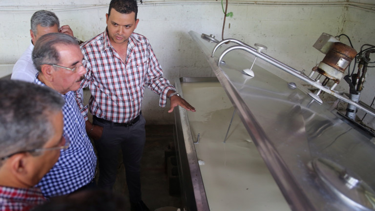 El presidente Danilo Medina y dirigentes de la Asociación de Ganaderos San Isidro (AGASI) y de la Federación de Mujeres en Desarrollo de Guerra (FEMUGUE), quienes pidieron apoyo para construir un centro de acopio que les permitiría agregar valor a la leche que producen y conservar mejor el producto. El centro beneficiaría tanto a los ganaderos como a las mujeres asociadas en FEMUGUE.