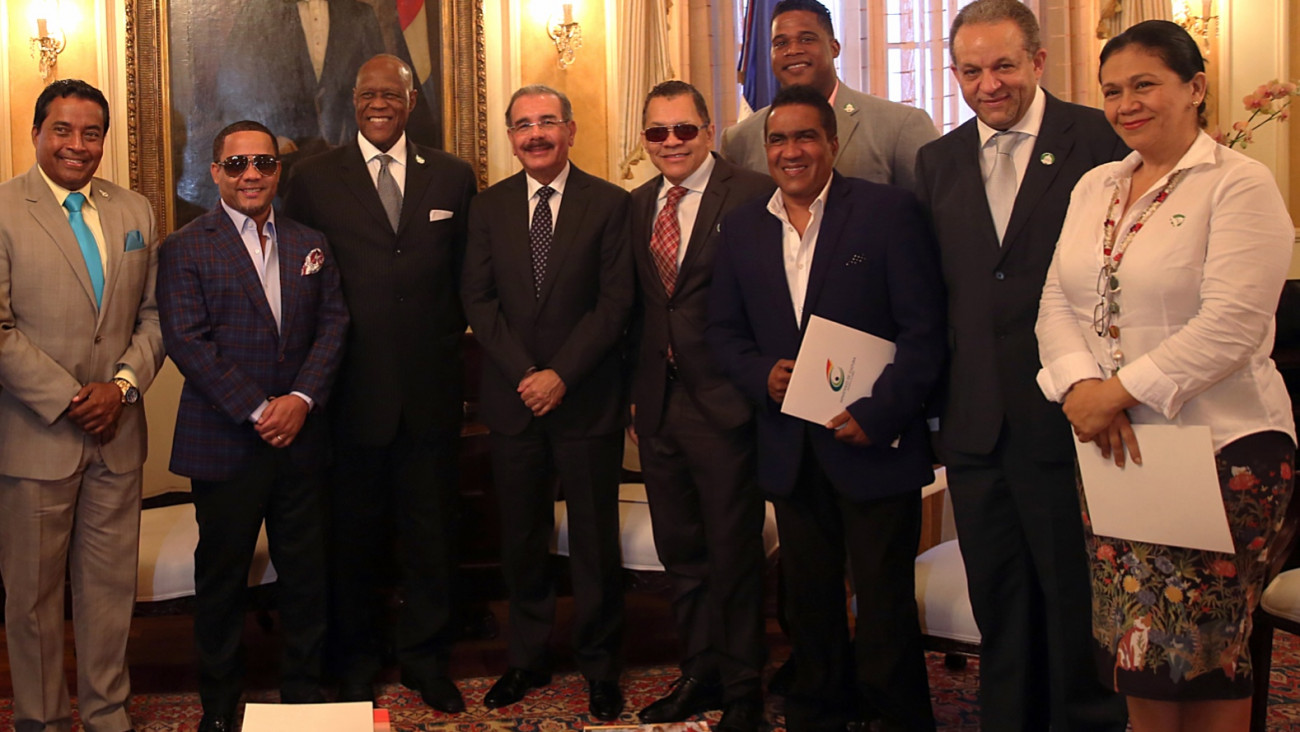 Presidente Danilo Medina Sánchez acompañado de los artistas Johnny Ventura, Kinito Méndez, Rafa Rosario, Héctor Acosta (El Torito), Juan de Dios (Jandy) Ventura, Roberto del Castillo y la cantante Maridalia Hernández. Asimismo, el viceministro de Cultura para Asuntos de Creatividad, Tommy García; el jefe del Gabinete Ministerial de Cultura, Carlos Salcedo y el arreglista Manuel Tejada, presentes durante el encuentro efectuado en su despacho del Palacio Nacional.
