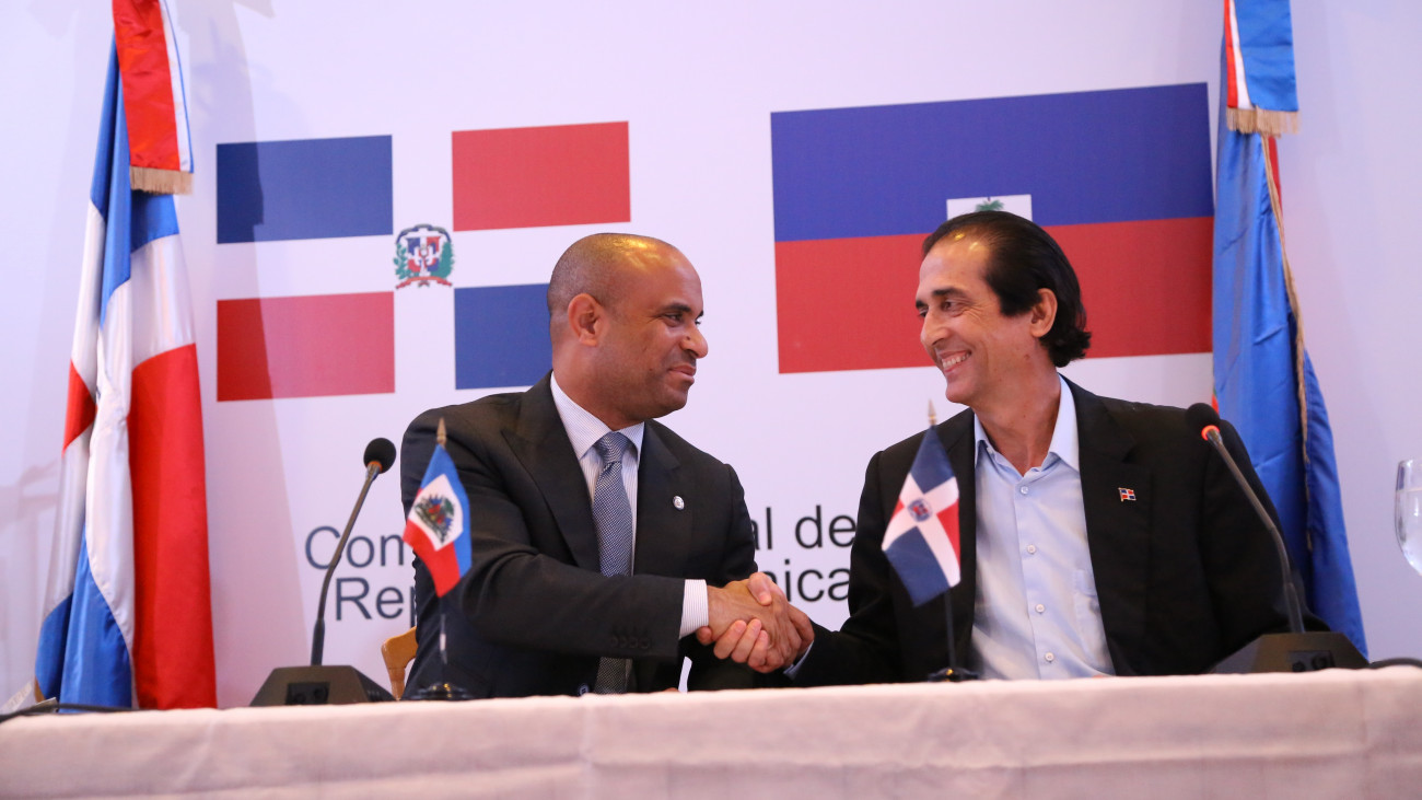 El ministro de la Presidencia dominicana, Gustavo Montalvo y el primer ministro hatiano, Laurent Lamothe, se estrechan las manos luego de la firma de la Declaración de Juan Dolio, durante la reunión de las comisiones del Diálogo Bilateral de Alto Nivel República Dominicana-Haití para dar seguimiento a los acuerdos de las reuniones anteriores y avanzar en nuevas propuesta, en Juan Dolio, provincia San Pedro de Macorís.