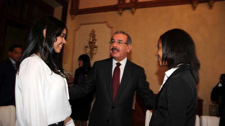 Presidente de la República, Danilo Medina Sánchez mientras conversa con estudiantes meritorias de las escuelas del Noreste de los EEUU, presente en el encuentro con el mandatario efectuado hoy en el Palacio Nacional.