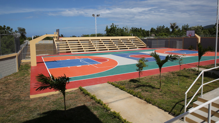 Cancha deportiva del Centro Educativo del Nivel Medio Barahona II, inaugurado en acto conjunto presidido por el presidente de la República, Danilo Medina Sánchez, el ministro de Educación y principales autoridades de la provincia.