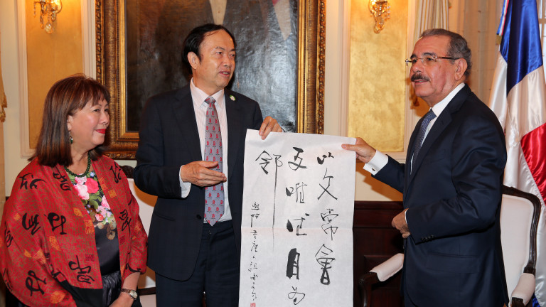 Presidente de la República, Danilo Medina Sánchez y señor Yuan Xikun, reputado escultor y pintor de su nación, durante su visita de cortesía al mandatario. .Xikun, quien también es miembro del Séptimo Comité Permanente de la Federación de la Juventud China, donará esta tarde una escultura de Juan Pablo Duarte, al Banco de Reservas. El artista precisó, que esa admiración por Duarte, lo llevó a donar una estatua del fundador de la nacionalidad dominicana al Museo de Arte de la Organización de Estados Americanos (OEA).