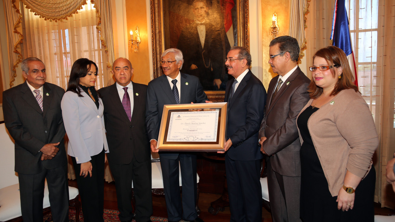 Participación del presidente de la República, Danilo Medina Sánchez y directivos de la Asociación Dominicana de Prensa Turística (ADOMPRETUR), al recibir el galardón que lo acredita como Personaje Turístico del Año 2013, en reconocimiento a su firme compromiso con el fortalecimiento del turismo.